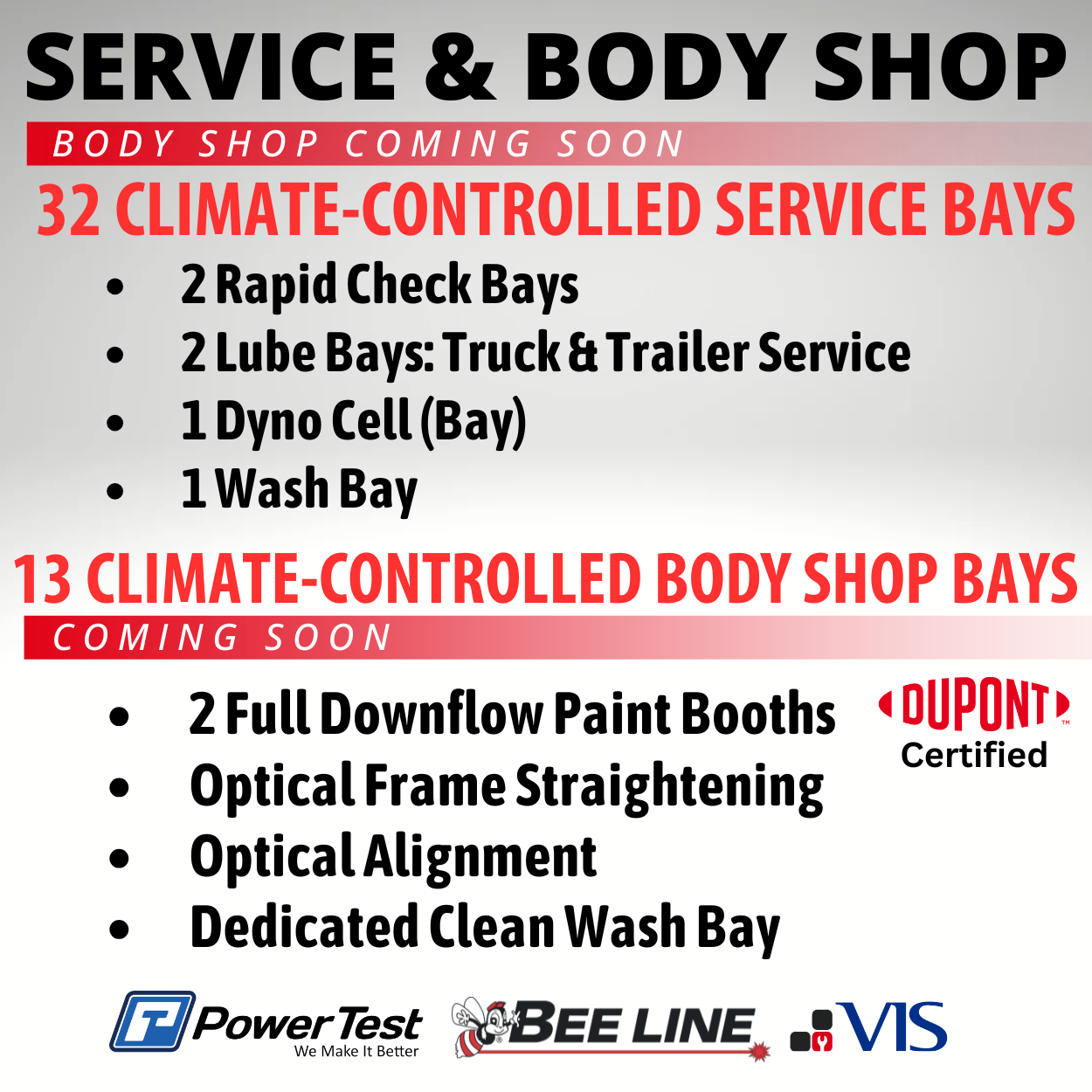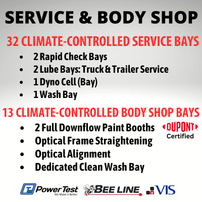 The service center features 32 climate-controlled service bays and a 13-bay climate-controlled body shop,